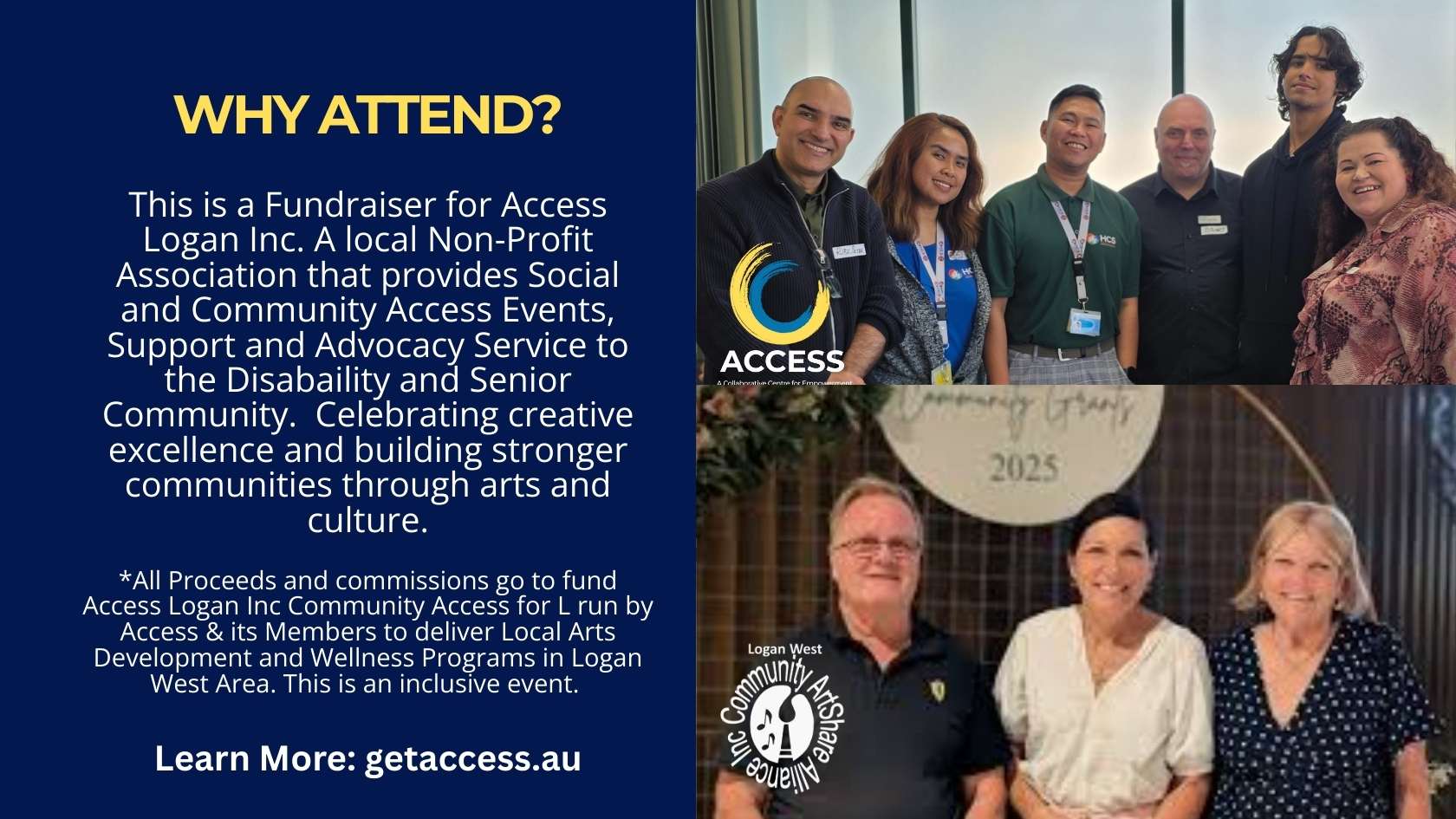 6:00 PM – LATE | A formal evening celebrating local artists and community impact. Includes dinner, complimentary champagne / soft-drink on entry, entertainment, art showcases, Music, networking with sponsors and community leaders, fundraising auctions, and a night of good old fashioned fun. | Art collectors, local businesses, sponsors, community leaders, and arts supporters. | Fitzy's Loganholme Function Centre |